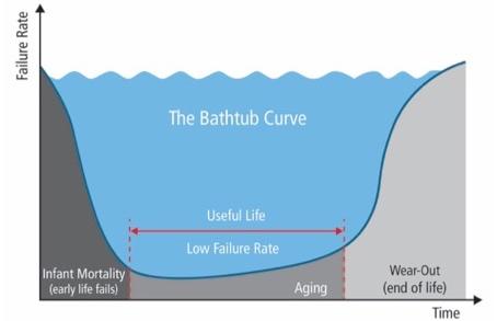 Pokud se elektronických výrobků vyrábí velké množství, je charakteristická míra poruchovosti v průběhu jejich životnosti známá jako křivka vany, a to díky tvaru znázorněnému níže.